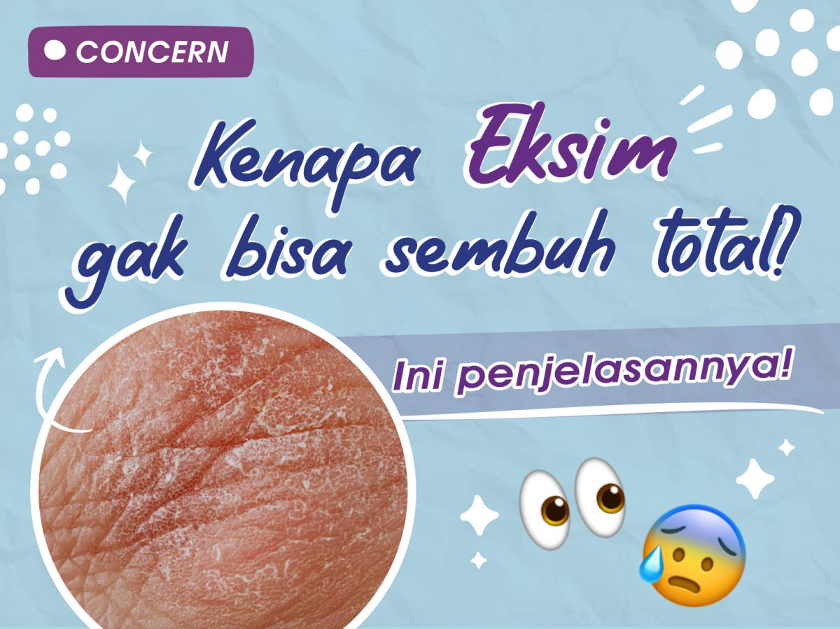 Eksim atau eczema adalah jenis dari masalah kulit yang memiliki kondisi kulit inflamasi dan bisa menyebabkan kulit sangat kering, gatal, kemerahan, pecah-pecah dan bersisik. Eksim bisa melemahkan skin barrier kamu, yang berfungsi melembabkan kulit dan melindungi tubuh dari lingkungan sekitar. Eksim merupakan kondisi yang umum dialami oleh siapapun, bahkan oleh bayi yang baru lahir. Penderita eksim tidak dapat menularkan dan ditularkan dari siapapun. Meskipun tidak menular, kondisi eksim bisa diturunkan dari orang tua ke anak atau faktor lingkungan. Namun, apakah eksim tidak bisa disembuhkan total? Yuk simak penjelasannya di sini!